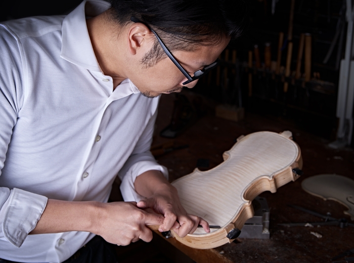バイオリン製作家とは、その名の通りバイオリン族、バイオリン、ビオラ、チェロそしてコントラバスまでを製作する職業です。クレモナのバイオリン製作家は2017年ユネスコ世界無形文化遺産に指定されました。バイオリン職人というと、少し広い枠組みになります。楽器を作る製作家、修理をする修復家や修理人などに別れます。そして製作家の中でも、新しい見た目の楽器を作る製作家、わざと古い楽器のように作る製作家、実在する古い楽器をコピーする製作家などに細分化していきます。私は新しい楽器を作る製作家に属します。古い見た目の楽器などは製作しません。憧れた、歴史上の巨匠たちのように、新しいスタイルを提案する事を志しているからです。日本人は昔から全体の製作家の比率を考えると、とても多い業界です。日本はアメリカに次いで、楽器の購入が多い国で、マーケットがとても大きいのが一つの要因です。10年ほど前までは日本人学生が急激に増えていましたが、近年はそれほどでもなく、韓国人や中国人などが急激に増えている状況です。