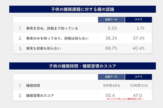 日本の子どもの睡眠時間は世界で最も短く、その課題は年々深刻化しています。全国の睡眠実態調査結果からは、日本の子どもの睡眠時間が世界で最も短いという事実を知っている人が全体の31.3%にとどまることが判明しており、日本においては親が子どもの睡眠について正しい情報を持っていないことが示唆されます。