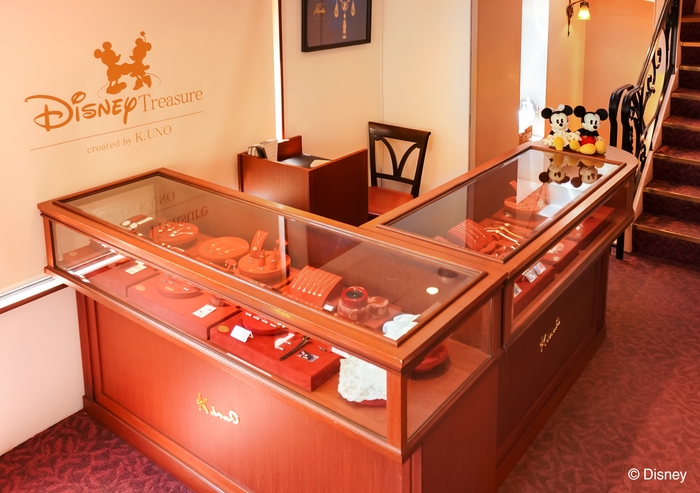 ケイウノでは、2010年より全国の直営店でディズニーデザイン ジュエリーの取り扱い並び、オーダーメイドを手がけています。「ディズニーコーナー」併設店は3店舗(横浜元町店、名古屋栄店、神戸店)あり、製作点数のわずかなジュエリーもディスプレイしています。
