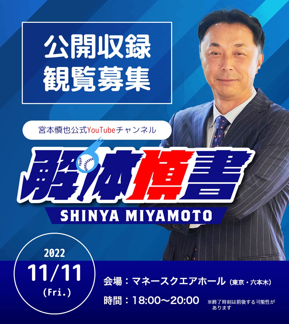 株式会社マネースクエア(本社:東京都港区、代表取締役社長:藤井 靖之、以下「当社」といいます。)は、この度、2022年11月11日(金)に当社のアスリートプログラムのアンバサダーである宮本慎也氏の公式YouTubeチャンネル『解体慎書』公開収録を行うことをお知らせいたします。