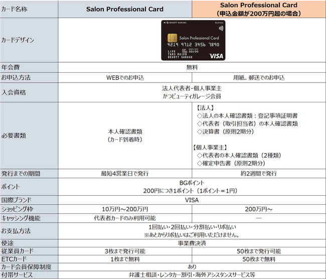 Salon Professional Card(サロンプロフェッショナルカード)は、理美容・エステ・ネイルなどの美容サロンを経営する事業者さまやフリーランスの方向けのビジネスカードであり、ビューティガレージでのお買い物はもちろんのこと、他店でのお買い物でもBGポイントがたまる、事業費決済専用のビジネスカードになります。