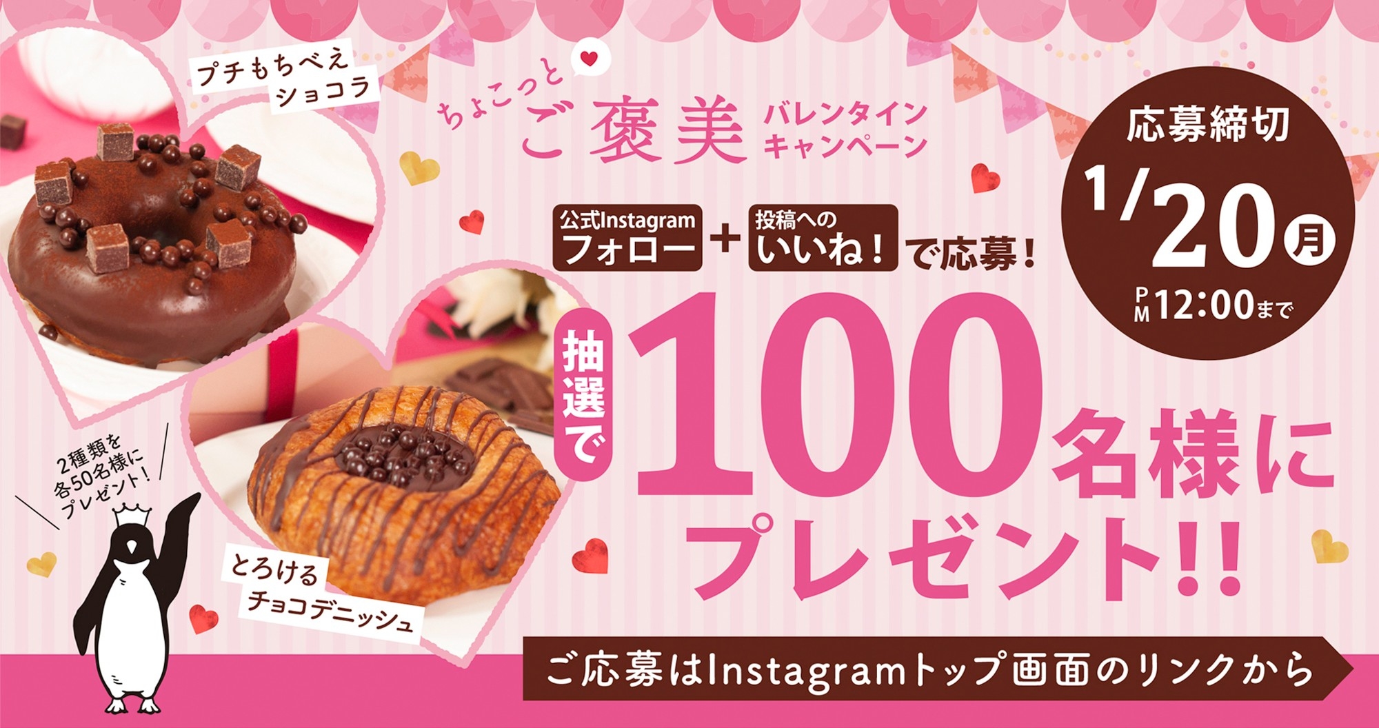 1月14日(火)にアップされるペンギン公式Instagramのキャンペーン投稿に「いいね!」をして、専用の応募フォームよりご応募いただいたお客様の中から抽選で「プチもちべえショコラ」もしくは、「とろけるショコラデニッシュ」をそれぞれ各50名様(最大100名様)にプレゼントいたします。