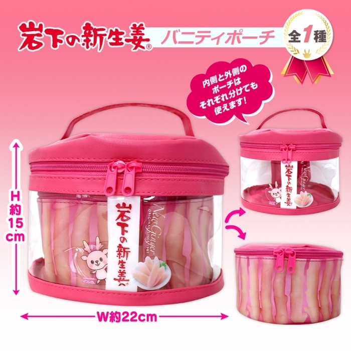 岩下の新生姜の商品パッケージをデザインしたバニティポーチ。外側のポーチには岩下の新生姜の商品ロゴと岩下の新生姜公式キャラクター「イワシカ®」をプリント。内側のポーチには、岩下の新生姜の中身をプリントしました。2つのポーチが2層にセットされており、それぞれ分けても使えます。