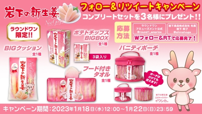 岩下の新生姜アイテムの登場に先立ち、1⽉18⽇(水)12:00から1⽉22⽇(⽇)23:59まで、岩下の新生姜アイテム4種のコンプリートセットが3名様に当たるTwitterフォロー&リツイートキャンペーンを実施します。ROUND1アミューズメント【公式】アカウント(@round1_amprize)と岩下食品(株)社長 岩下和了アカウント(@shinshoga)をそれぞれフォローし、キャンペーンツイートをリツイートして応募完了となります。