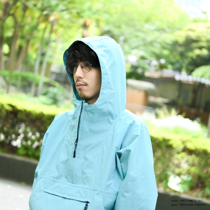 アウトドアシーンで便利なアノラックタイプのレインジャケット。フード廻りにアジャスターコード付で、フロントポケットへ収納するポケッタブル仕様になっています。止水ファスナーを採用されており、縫い目にはシームテープを施しているので、浸水も軽減される仕様になっています。