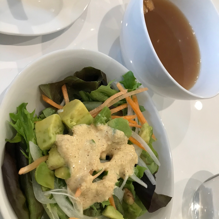 自家製ドレッシングサラダと玉ねぎたっぷりのスープが付きます。