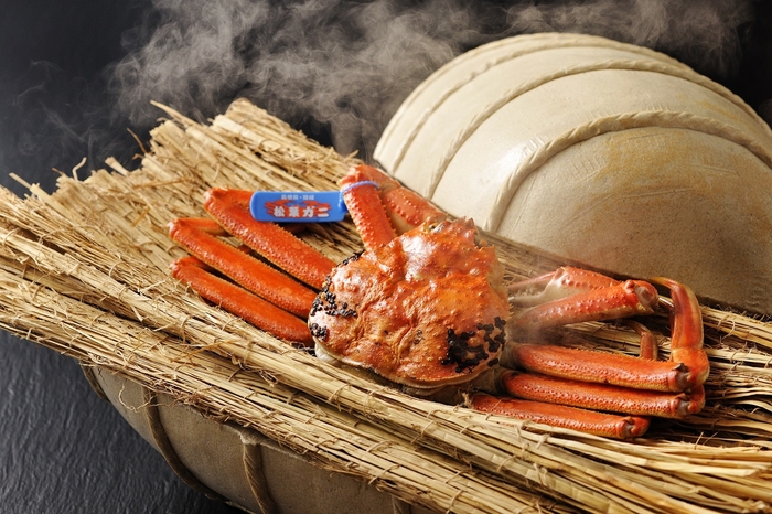 メイン料理は、松葉蟹を稲わらで包んで蒸しあげた「活蟹の豊年蒸し」。出雲大社にゆかりのある五穀豊穣の神様、大国主命(おおくにぬしのみこと)からヒントを得た蒸し蟹料理です。稲わらで包み、俵型の器で提供します。稲わらで包んだまま蒸し上げているため、味に豊かさが増します。ほんのりと香るわらの香りとともに堪能できる一品です。