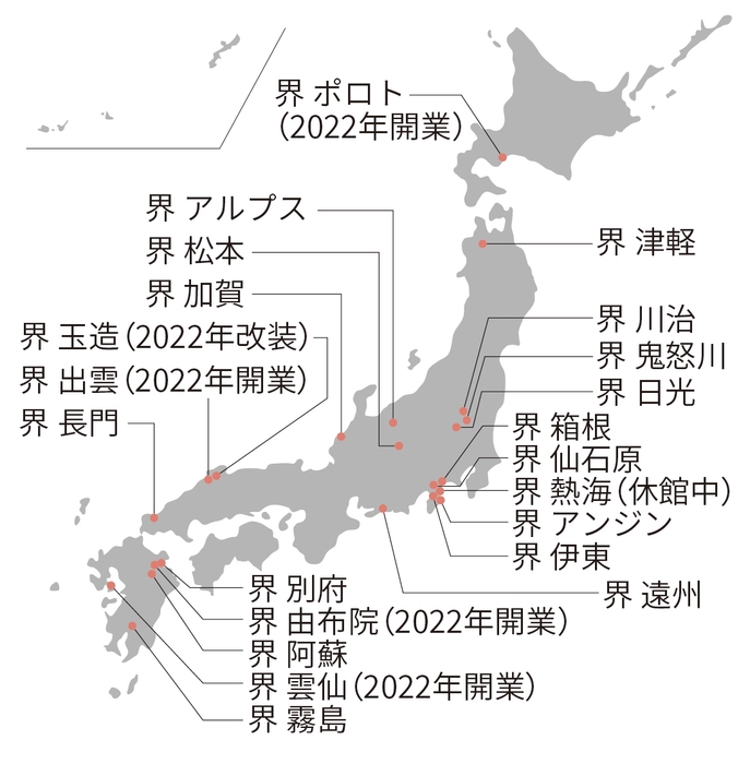 「界」は星野リゾートが全国に展開する温泉旅館ブランドです。「王道なのに、あたらしい。」をテーマに、季節の移ろいや和の趣、伝統を生かしながら現代のニーズに合わせたおもてなしを追求しています。また、その地域の伝統文化や工芸を体験する「ご当地楽」や、地域の文化に触れる客室「ご当地部屋」が特徴です。現在、全国各地に展開しており、2022年1月に19施設目となる「界 ポロト」が北海道・白老温泉に開業しました。