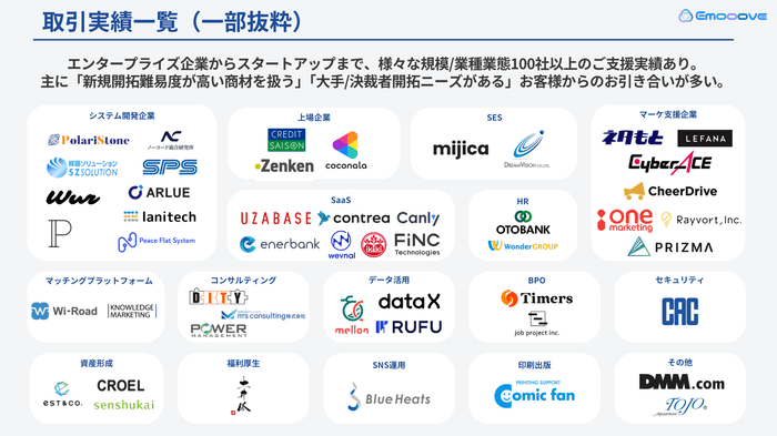 特に、「大手企業〜スタートアップ企業の決裁者開拓」に強みを持っており、これまで様々な業種業界、規模感のお客様とお取引をさせていただいております。