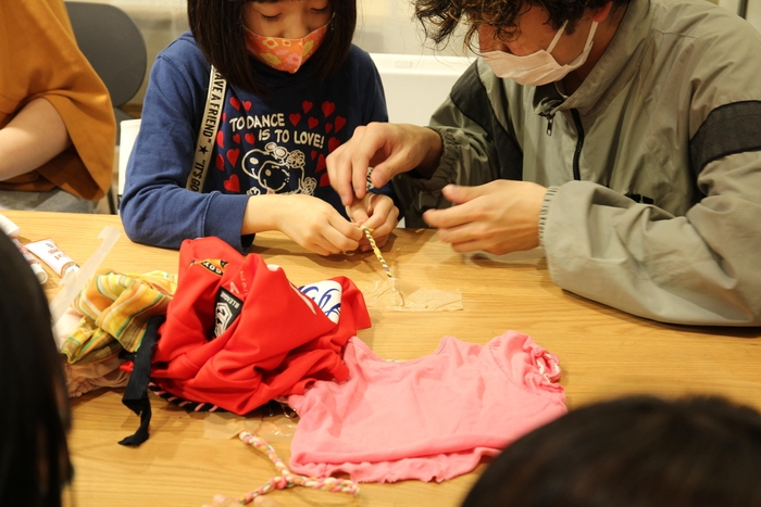体験イベントにはSDGsに関心の高い方や親子連れが参加。子供たちは成長とともに着られなくなったお気に入りの服を持ち込み、学生たちと一緒にショルダーストラップを完成させました。