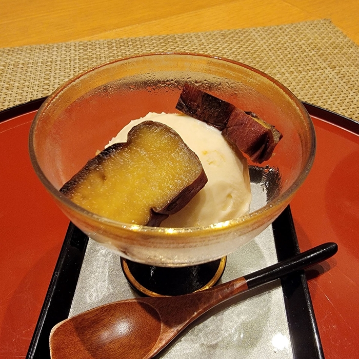 甘味箱には季節のアイスが付いていますが、秋メニューでは熟成焼き芋ジェラートに変更。熟成された焼き芋の風味とクリーミーな口当たりを存分に楽しんでください。