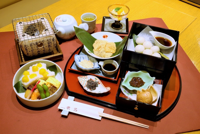 甘味箱には、口の中でとろーりとろける国産わらび粉を使った自家製わらび餅、七輪でお好みの焼き加減で味わえる自家製みたらし団子、粒の大きな北海道産小豆を使った自家製粒餡(あん)を挟んで味わえる最中がセットになっています。