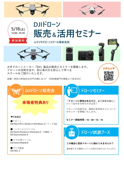 2024年5月18日(土)にDJI製品(ドローン・DJIハンドヘルド)の販売とドローンセミナーをマジオドローンスクール海老名校で開催します!