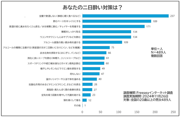 2024年11月、大正製薬株式会社が「二日酔いの経験がある」人489人を対象に「取り入れている二日酔い対策」について調査したところ、多い順に「空腹で飲酒しない(事前に軽く食べるなど)」237人、「飲むペースをゆっくりにする」189人、「飲酒の前に真水をたくさん摂る/水を頻繁に飲む/チェイサーを用意する」171人、「睡眠をしっかり取る」と「ウコンやタウリン・しじみサプリなどを飲む」が同列で134人という順でした。