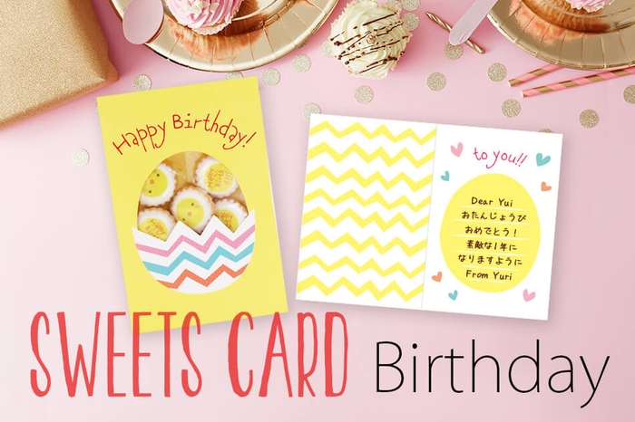 スイーツカードは、表面の窓からお菓子が見えるようになっており、お菓子もデザインの一部となっています。