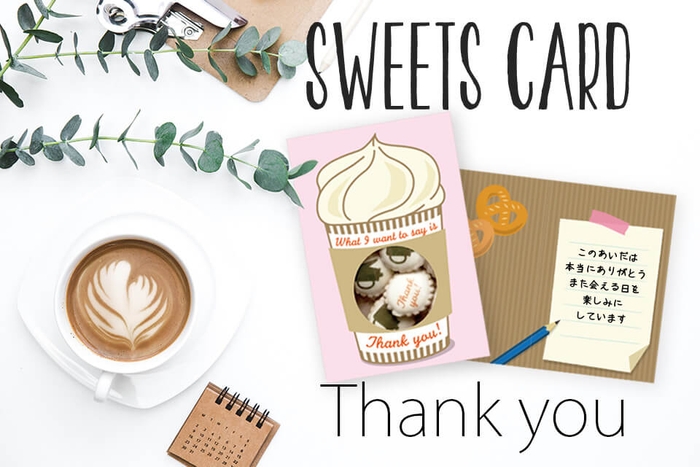 スイーツカードはカードの内側もフルカラーデザイン。かわいいイラストの中に一言メッセージが書けるようになっています。一言でOKだから、身近な友達にも気軽に送ることができます。