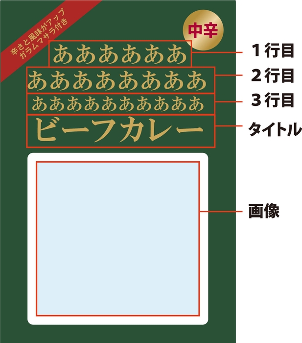 本格的な味わいのレトルトカレー「ビーフ」「チキン」のパッケージをオリジナルで作ることができるノベルティアイテムです。これまで、アイテムによって[画像のみ/文字のみ]と制限がありましたが、今回リニューアルにあたり「ビーフカレー」「チキンカレー」どちらでも自由に作ることができるようになりました。