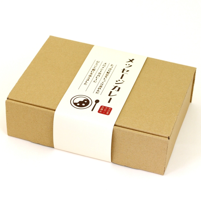 会社の記念品に。イベントのお持ち帰りギフトに。そんなシーンにぴったりな6個セットの箱入りにすることも出来ます。クラフト箱に[メッセージカレー]の巻紙をつけた仕様にて、お届けいたします。
