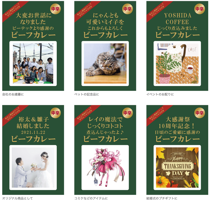 本格的な味を追求したカレーのパッケージを簡単デザインできちゃう人気ノベルティ。写真も入れられるビーフ/文字だけOKのチキンも新登場!
