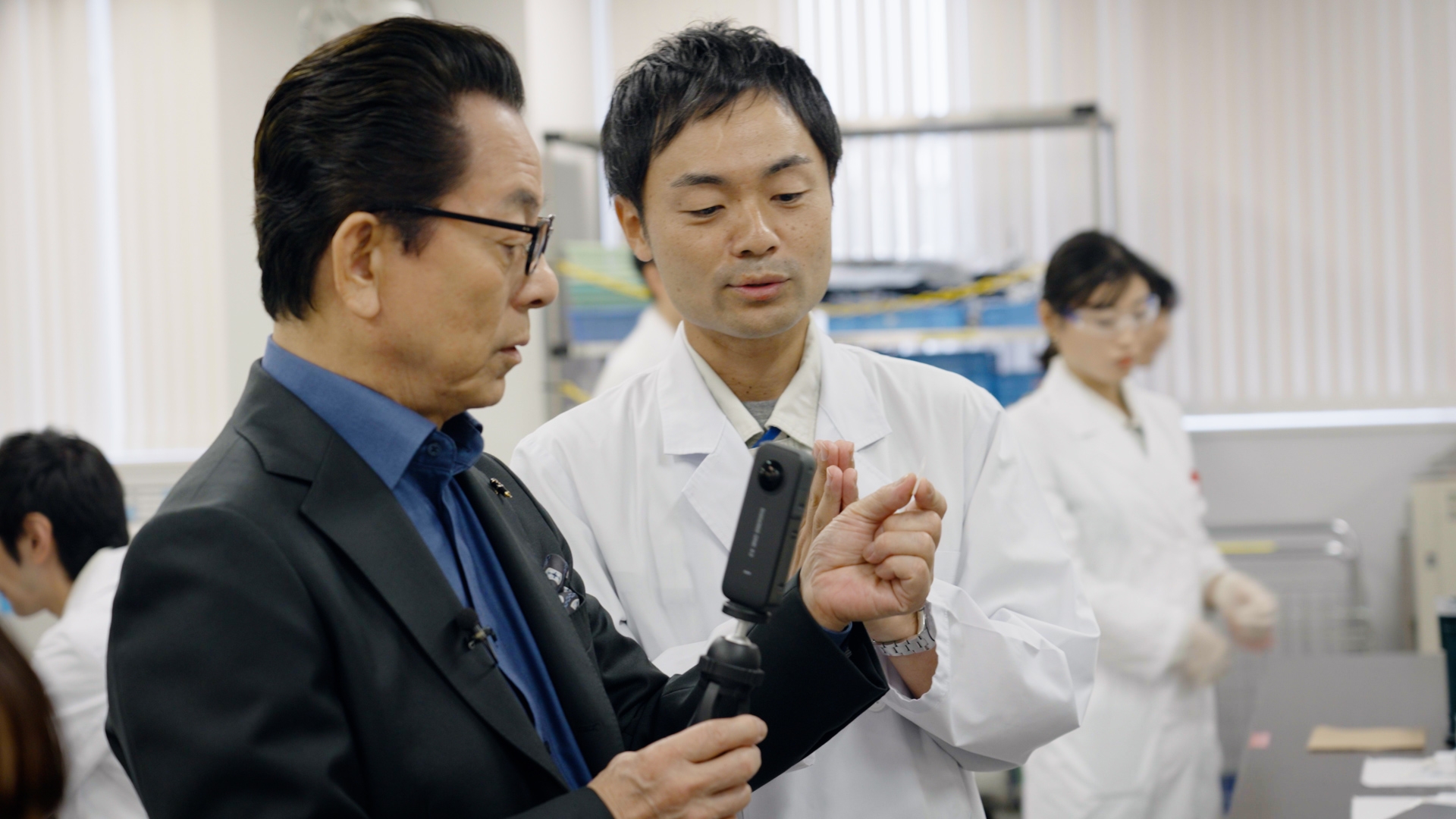 動画では、水谷さん自らがカメラを持つ場面もあり、説明を受ける時にはマイクを向けて話を聞くなど撮影に積極的に参加していただきました。興味津々で試験の様子を覗き込み質問をする知的好奇心が旺盛な姿や、製造工程での厳格な品質管理を目の当たりにして思わず「うわー!」と声を出して驚く様子など、テレビではなかなか見られない素の表情が伝わる動画となっています。