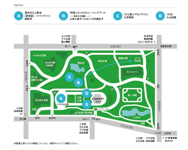 と題し、会期を二つに分け、パブリックアートからパフォーミングアーツまでの多様なアートを通じて、日比谷公園の奥深い魅力に触れて頂くプログラムを展開します。