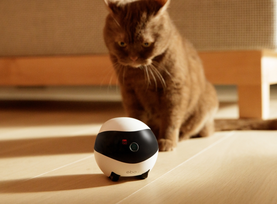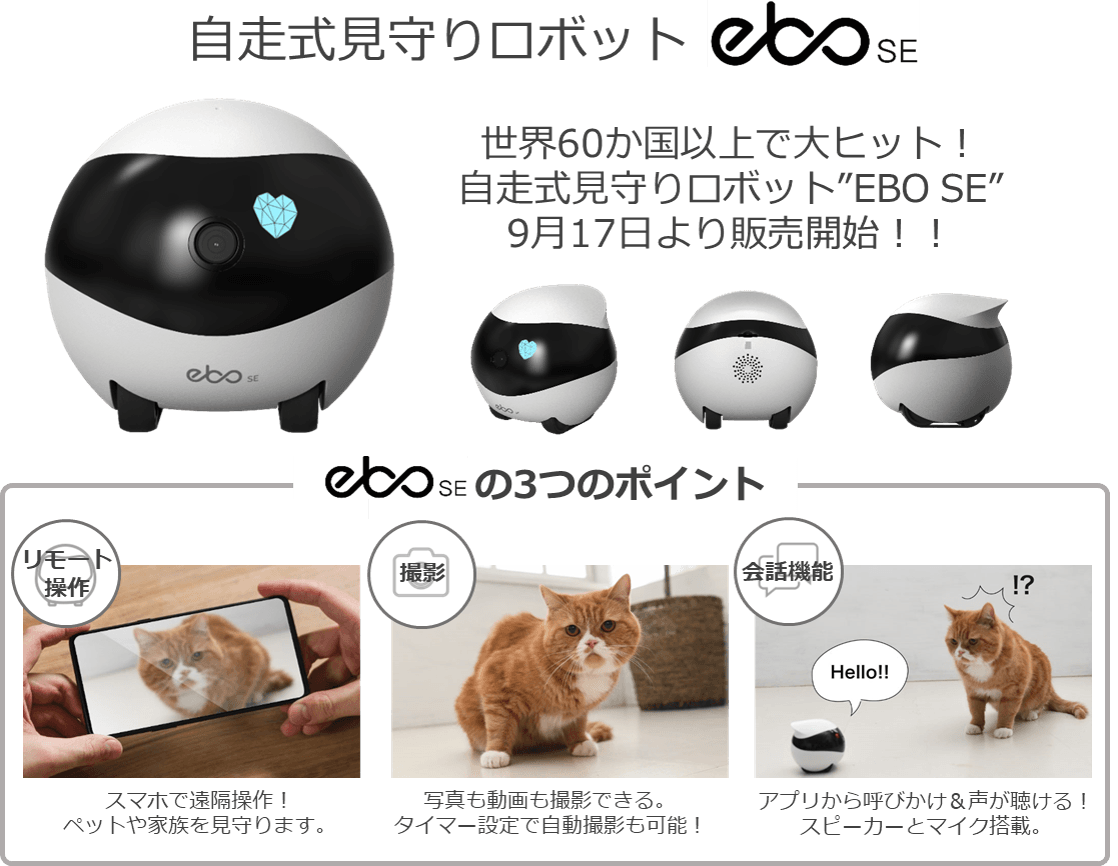 販売を開始する「EBO SE」は、愛猫家の心配ごとを解消してくれる自走式見守りロボットです。Wi-Fi環境があれば、スマートフォンひとつで、だれでも、どこででも簡単に操作ができて留守番中の猫を常に見守ることができます。また、アプリを使って呼びかけやペットの声を聴くことができて、写真や動画の撮影をすることも可能です。自走式であり、生き物のように動くので、猫の遊び相手として寂しさや退屈をまぎらわしてくれます。