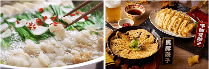 右:期間限定で「黒豚餃子」が登場。定番の「宇都宮餃子」とその美味しさを味比べでお楽しみください。