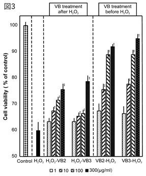 皮膚繊維芽細胞に酸化ストレスを与えると、細胞生存率が59%にまで低下する実験系において、VBを添加すると、細胞生存率は濃度依存的に上昇し、最大で76%(VB2)、78%(VB3)となった。またVBを添加するタイミングは、酸化ストレスを与える前(前処理)の方が、後処理より細胞生存率が有意に高く、より強い細胞保護作用が認められた。