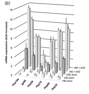 VB化合物(VB2/VB3)を単独で正常な皮膚繊維芽細胞に添加しても、HspのmRNA発現に大きな変化は見られなかったが、刺激としてAGEが付加された状態でVBを添加させた際には、特に細胞内タンパク質の品質を保持するようなHspの誘導が示された。
