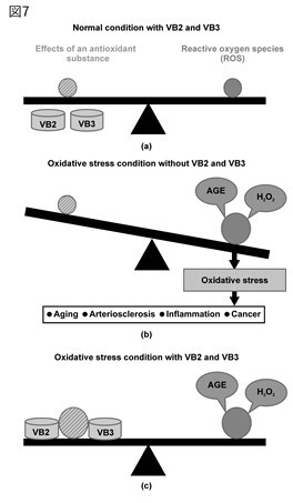 酸化ストレスを与えると、細胞内のSODの産出は56%に抑制される実験系において、VBを添加すると、VB2、VB3ともに濃度依存的にSODの抑制を回復させる傾向が認められた。
