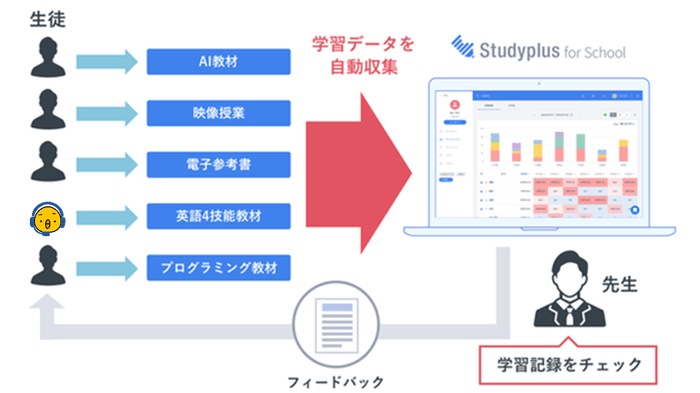 スタディプラスが提供する「Studyplus for School」は、生徒と先生を学習記録アプリ「Studyplus」でつなぎ、生徒の日々の学習ログを先生が見守り助ける、教育機関向け学習管理プラットフォームです。紙の教科書や参考書からデジタルの映像教材や演習教材まで、あらゆる学習ログを一元化・可視化することで、先生の業務負荷を軽減しながら、生徒一人ひとりの学びの個別最適化をご支援します。文部科学省CBTシステム「MEXCBT」と接続する学習eポータル。