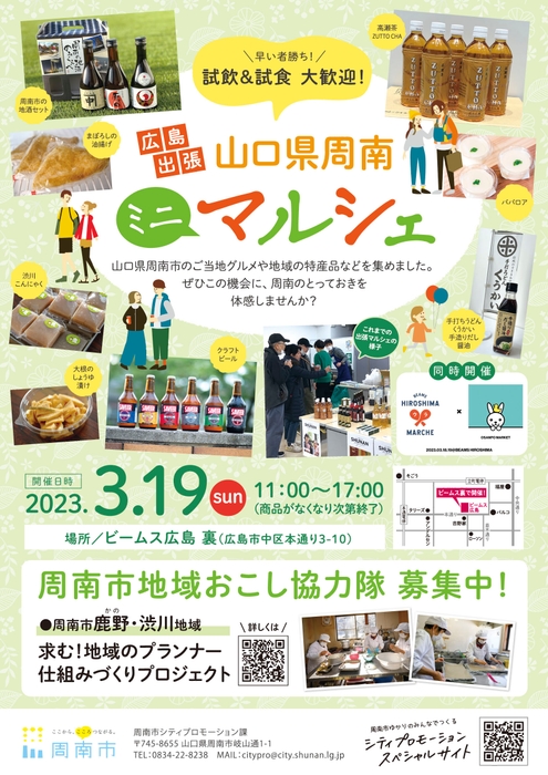 山口県周南市は、周南市のご当地グルメや地域の特産品を集めた「広島出張 山口県周南ミニマルシェ」を2023年3月19日(日)にビームス広島 裏 にて開催いたします。