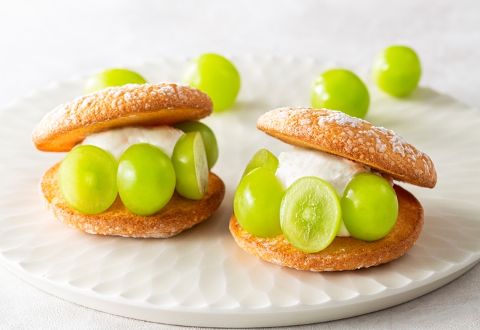 乳脂肪分40%の濃厚な生クリームに旬のシャインマスカットを贅沢に合わせた季節限定の生ナボナです。シャインマスカットの上品な香りとジューシーな味わいが引き立つよう、クリームには刻んだシャインマスカットとサワーミルクを加え、ヨーグルト風味のさっぱりと食べやすいクリームに仕上げました。