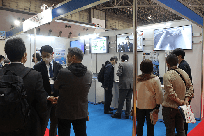 会場一角の理大などのブースでは、2基の画面で好適環境水®による養殖実績と、国内で初めて成功したベニザケ養殖ビデオを放映。いちいは福島市の養殖水槽の様子をライブ放映しました。水産業者や取り扱い業者、養殖事業を検討する企業関係者が訪れ、山本俊政工学部応用化学科准教授らが事業や好適環境水®について説明しました。