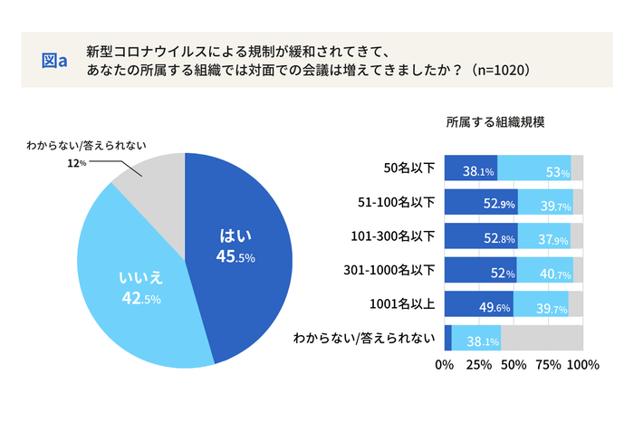 まず「対面会議が増えたか」について尋ねてみたところ、「はい」と答えた人は45.5%、「いいえ」と答えた人は42.5%と、全体の回答ではどちらもほぼ同じ割合となりました。しかし、所属する組織規模でみると50名以下の企業では「いいえ」が53%と「はい」の38.1%を上回る結果となり、企業規模が小さいほど規制緩和の影響が小さく、非対面の会議を維持する方向であることが示唆される結果となりました。
