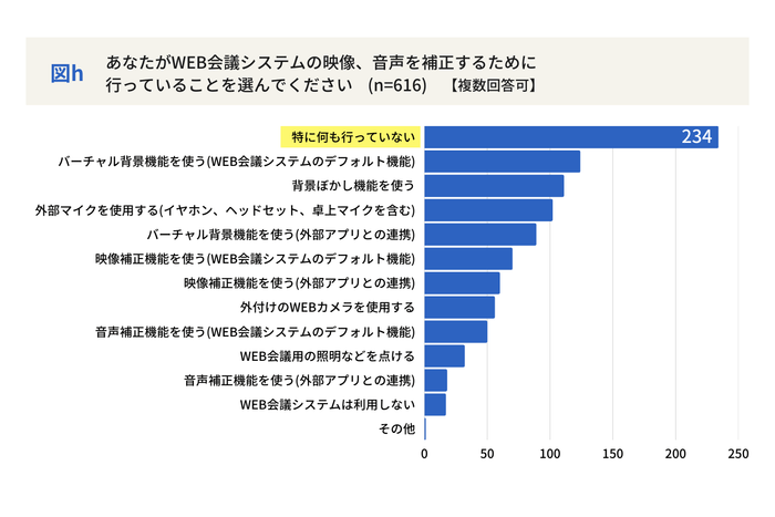 最後に、WEB会議システムを利用する際に行っている映像や音声の補正に関して質問したところ、回答の圧倒的な第1位が「特に何も行っていない」とのことでした。