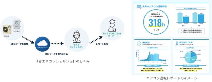 新たに提供を開始する『省エネコンシェルジュ』は、新モデルの『FIVE STAR ZEAS』のオーナーだけが利用できるサービスです。IoT機器で収集したエアコンの稼働時間や設定温度をまとめた運転レポートを専用WEBサイト上で閲覧でき、オーナーが普段から目安としている設定温度と実際の設定温度との乖離やエアコンの切り忘れなど、エアコン使用時の無駄を確認できます。また、専用コンシェルジュへWEBや電話で相談も可能です。今まで気が付かなかった無駄を削減する工夫の提案や便利な機能を紹介し、エアコンをより上手に使うための疑問や困りごとを解決します。