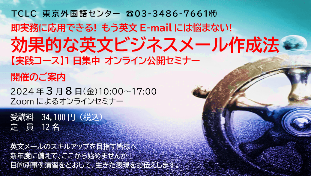 東京外国語センターは、公開講座「効果的な英文ビジネスメール作成法」セミナーをオンラインで開催します。