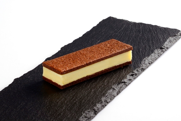クッキーサンドでは、ボンボンショコラよりもっと杏仁の風味を力強く表現することを松室さんは目指しました。クッキーは食感が強いので、そこに負けないように、選ぶカカオも「よりコントラストのはっきりしたものを」選びました。「杏仁そのものより杏仁らしく」をテーマに作られた全く新しいフレーバーのクッキーサンドです。