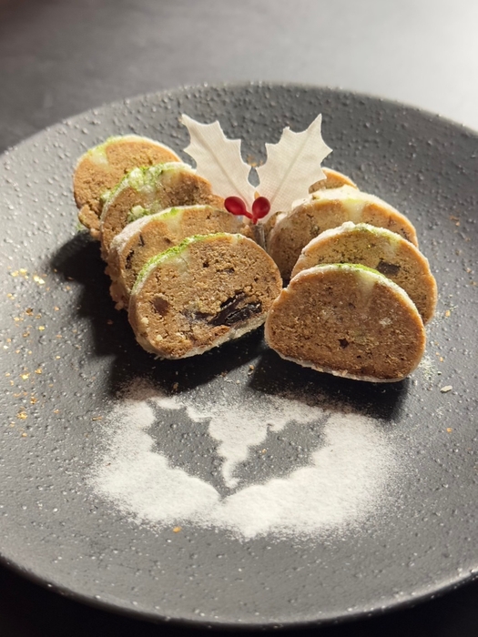 シュトレンは、キリストのお包みを模したドイツ発祥のクリスマス菓子です。今年は京都らしさを加え、丹波黒豆のきなこを取り入れました。ぜひ、旅館でのひとときに、日本の風味とヨーロッパの技術が調和したシュトレンをお楽しみください。