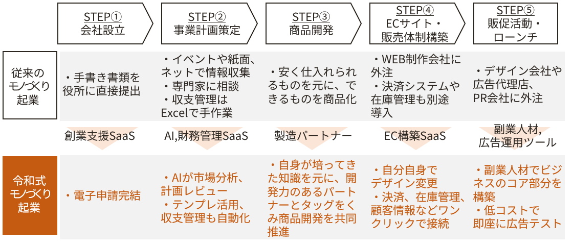 従来、創業の各プロセスにおいて手続きはオフライン中心で、ビジネス設計においては専門家やパートナー企業への依存度が高くハードルが高いと思っていましたが、悩んでいた時にAIの普及や副業の解禁が進み、創業や販売体制の構築、人材獲得など手間がかかる部分についての道筋が見えました。昨今はD2C冬の時代到来とも言われ、デジタルマーケティングの妙で売れてしまう時代から、本当に良いものしか消費者に支持されない時代になりつつあります。だからこそテクノロジーを駆使してモノづくりに集中すれば、それが市場での強みになるため、良いものを作る自信があるメーカー出身者などにはモノづくり起業の土壌が整ってきたと考えます。