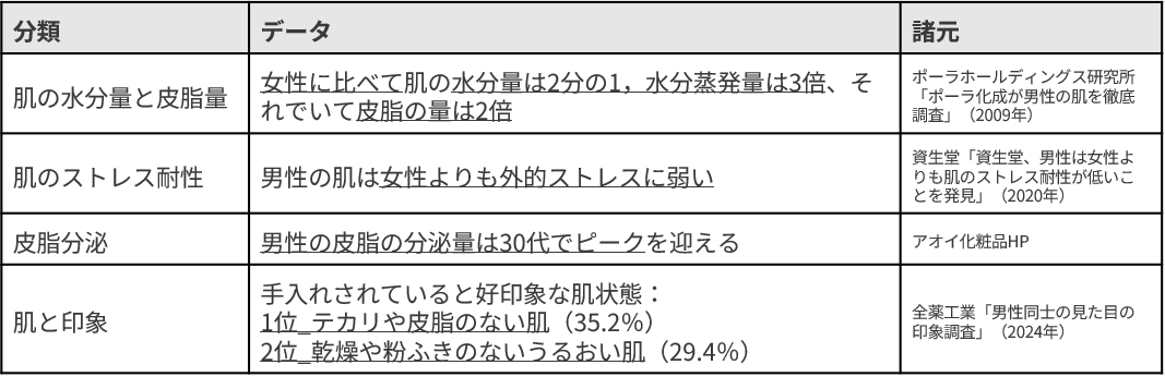男性の肌は女性の肌より水分量が少ない一方で皮脂量が多く、肌のストレス耐性が低いため、男性こそ丁寧なスキンケアが重要です。また、皮脂・テカリは印象に与える影響が大きく、男性の皮脂の分泌量は30代でピークを迎えるため、テカリを抑えつつも適度にうるおいのある好印象な肌質を目指しました。