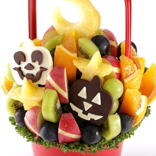 表情豊かなチョコレートのジャック・オ・ランタンがフルーツの間から飛び出す、ハロウィンだけの特別なデザイン。