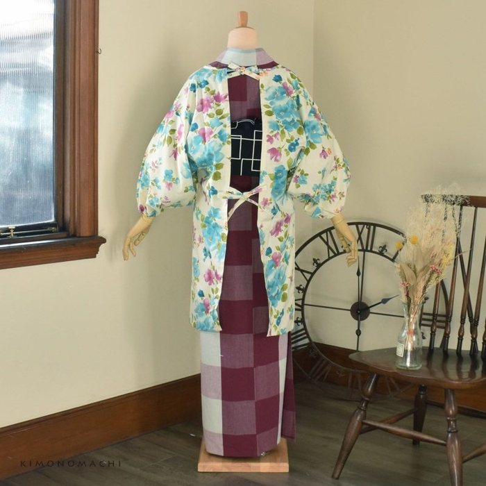 たっぷりとした袖で、袖口はゴム仕様、袖口から着物が出ず、邪魔にならないように工夫されている。