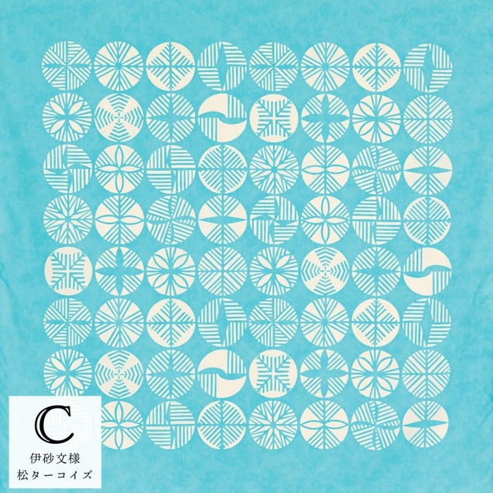 浅いターコイズブルーの地に薄いベージュ。若松や松菱などを丸くモダンにデザインしたさまざまな松の丸紋が並べられている。