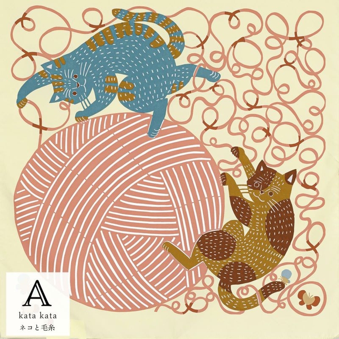 クリームイエローの地。やわらかいピンク、茶色の毛糸。黄茶色に茶色のブチ猫と、スモークブルーに白茶のブチ猫。猫と同色の蝶。毛糸玉にじゃれる猫の表情がかわいらしい風呂敷。