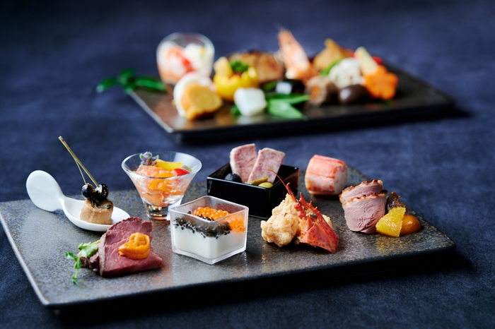 “鮑”や“天使の海老”などの豪華食材、縁起物の数々を使用し、シェフがお渡しする当日に仕上げる『和洋おせち』は、「出来立て」にこだわった特別な二段重。壱の重には煮鮑ステーキや天使海老甘煮などの和食、弐の重には幸せ絆牛のローストビーフやフォアグラと黒豆のテリーヌなどの洋食を彩鮮やかに盛り付けます。新年を迎えるにふさわしい、華やかな和洋のおせちをご家族でお召し上がりください。