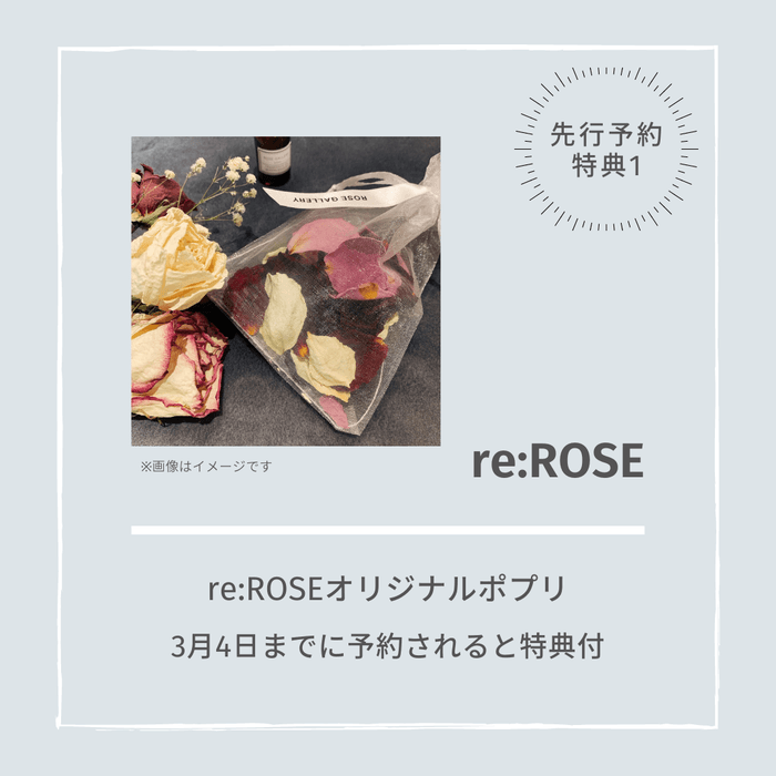 2022年2月18日~3月4日において予約いただいたお客さまにはre:ROSEオリジナルポプリとメレンゲ菓子を1つプレゼントいたします。