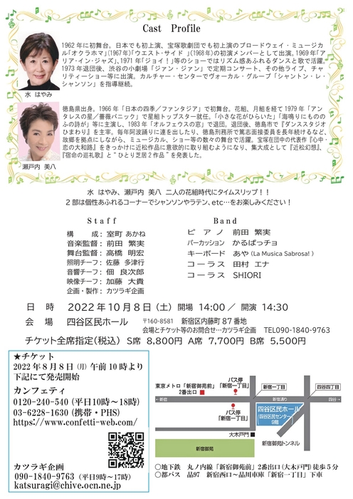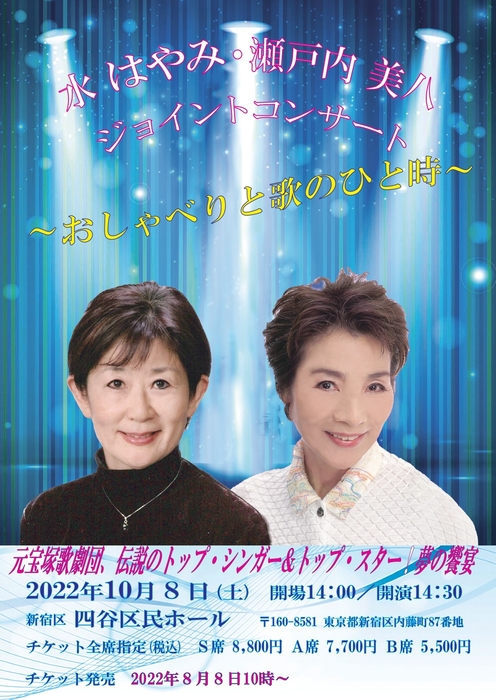 カツラギ企画主催、『水はやみ・瀬戸内美八 ジョイントコンサート ~おしゃべりと歌のひと時~』が2022年10月8日 (土)に四谷区民ホール(東京都新宿区内藤町87)にて開催されます。