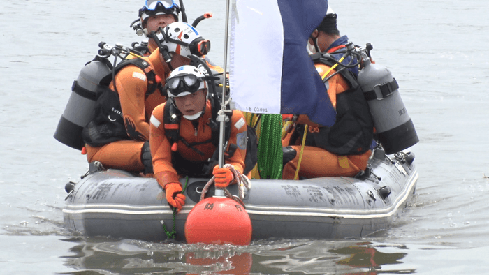 山田さんが「水難救助隊」として川で訓練をするのはまだ6回目。川のどこにあるかは知らされていないダミーの人形を確保したら訓練終了というミッションで、20分を目標に3人のチームで水深3.6メートルの川底まで潜ります。